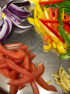 Vegetables: Onion (chopped and sliced), tomato (puree and sliced), sliced ginger, sliced mixed bell peppers (capsicum), green chili, coriander leaves.